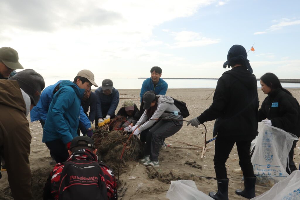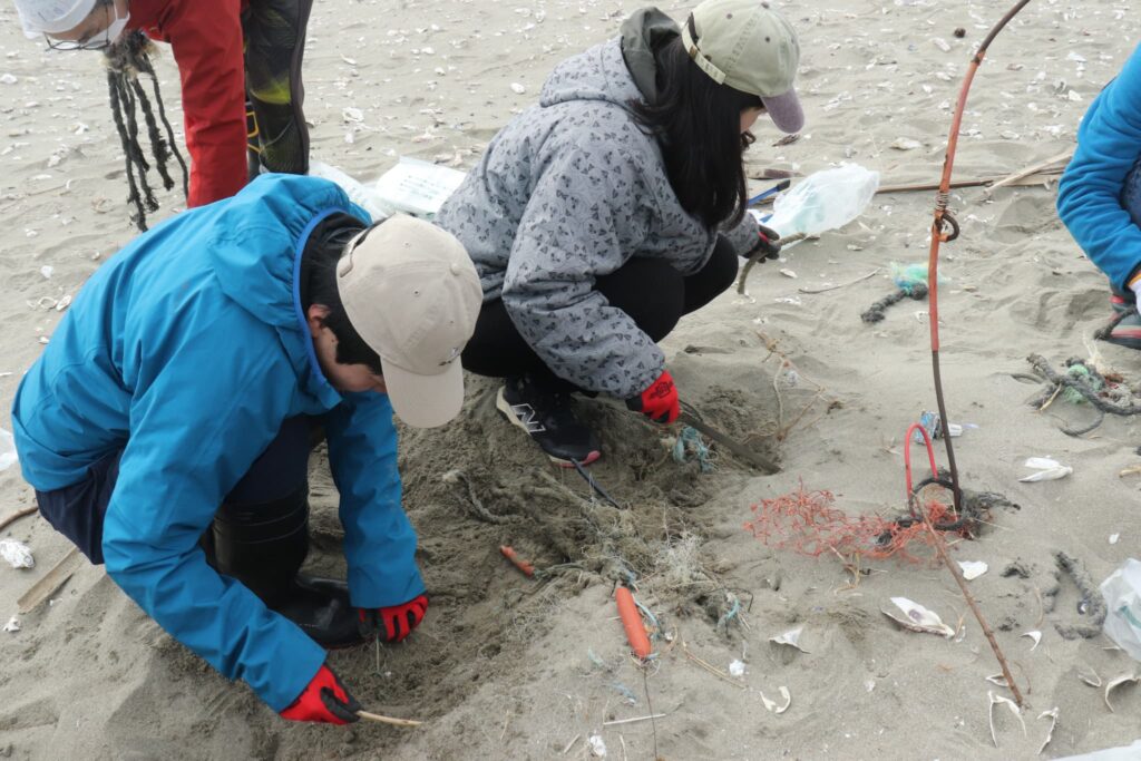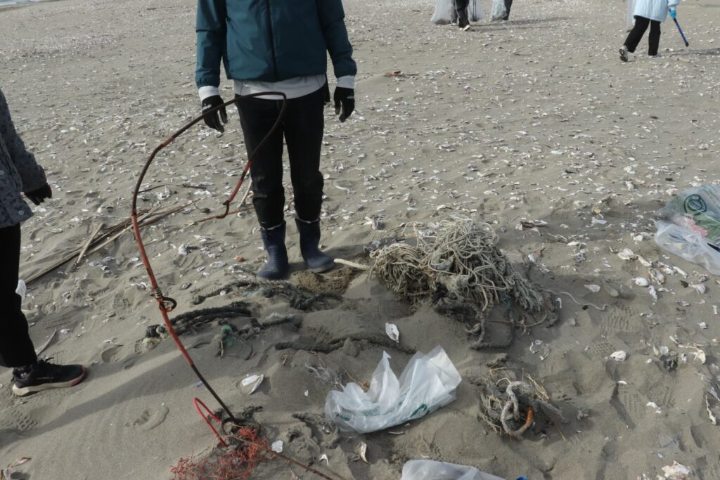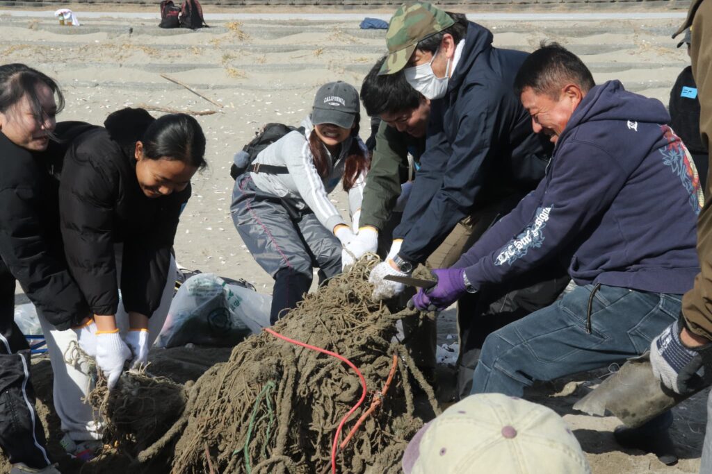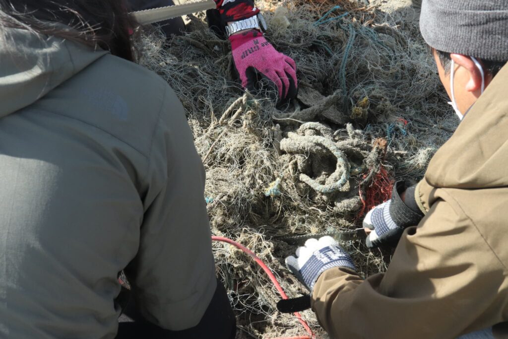 清掃の途中、砂浜に埋もれた魚網とロープの塊を発見。