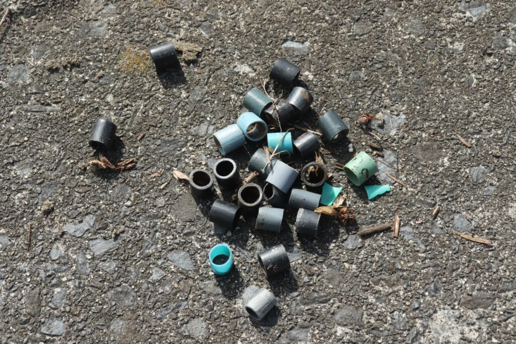 風で飛ばされたごみが雑草に絡まってしまっています。