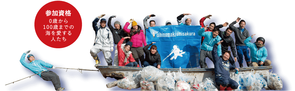 「石巻海さくら」は、神奈川県の江ノ島で2005年から活動している「湘南・海さくら」代表の古澤純一郎さんとの出会いから生まれました。2012年11月より石巻・女川の海でゴミ拾いの活動を開始しました。
